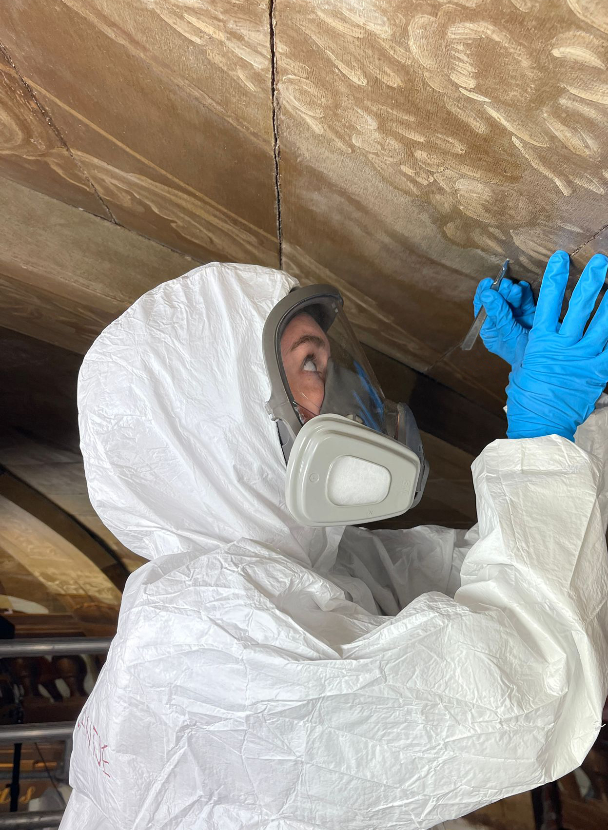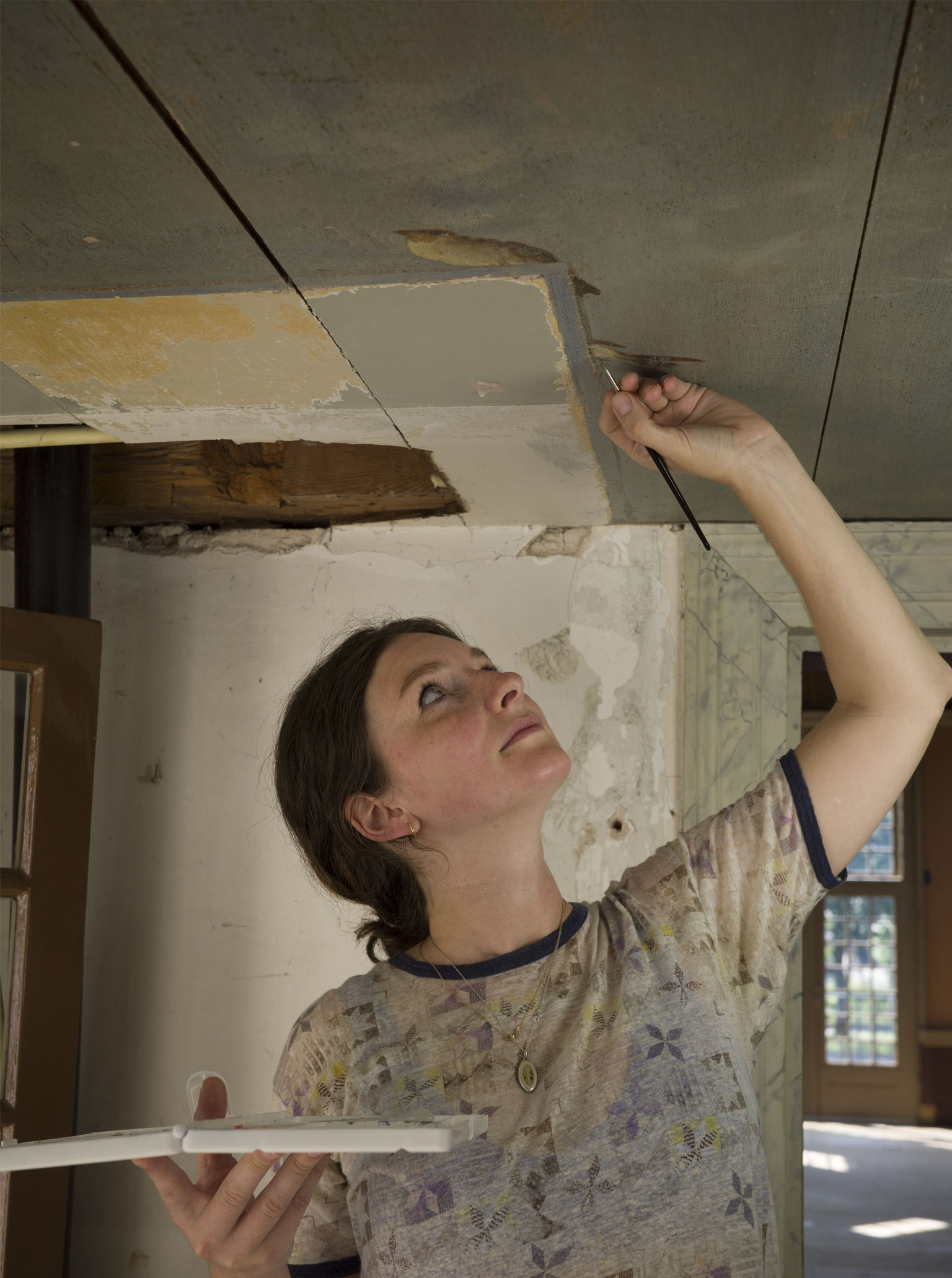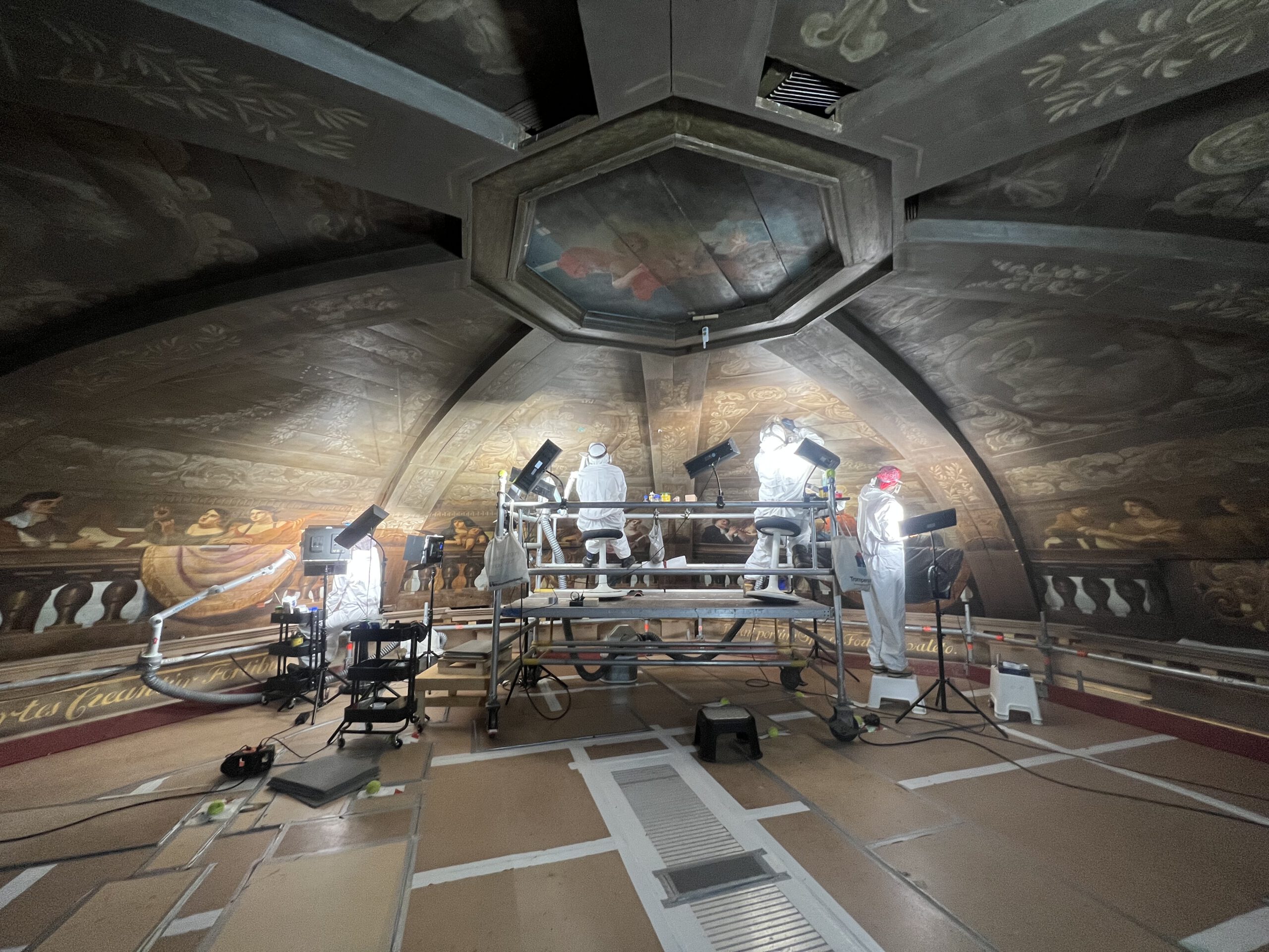 In 2023-2024 werkte ik in een groot restauratieteam aan het vrijleggen en restaureren van de zeventiende-eeuwse schilderingen op Trompenburgh. We werkten in het koepelgewelf, waar negentiende-eeuwse bruine overschilderingen werden verwijderd om de oorspronkelijke zeventiende-eeuwse schilderingen weer zichtbaar te maken. In het corps de logis en het tussenlid werd het met vogels beschilderde plafond, dat eeuwenlang onder witte verflagen was verborgen, vrijgelegd. De restauratie stond onder leiding van Ruth Jongsma en Annefloor Schlotter.