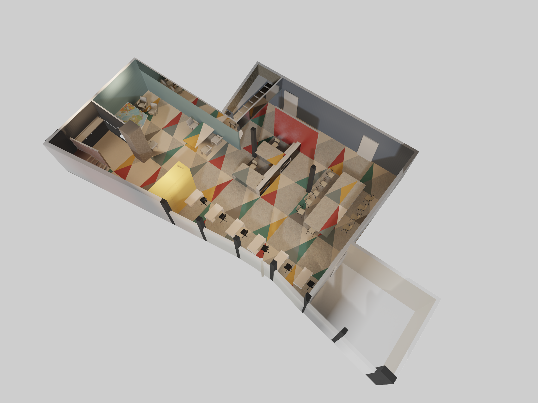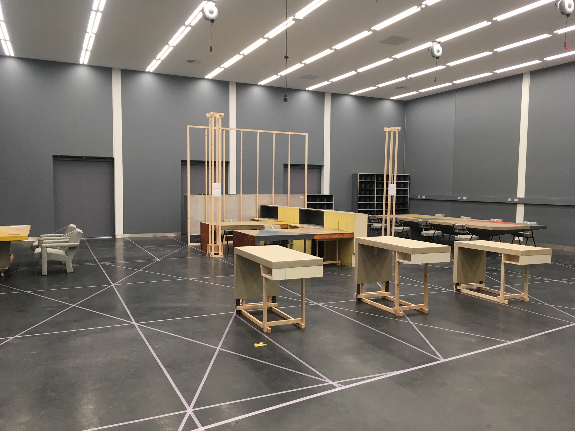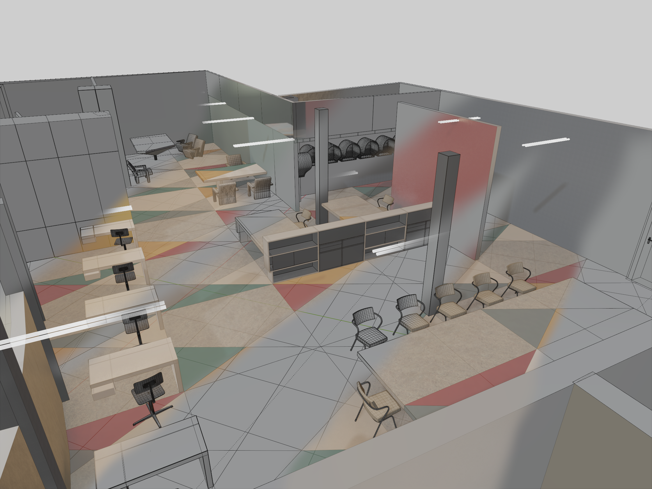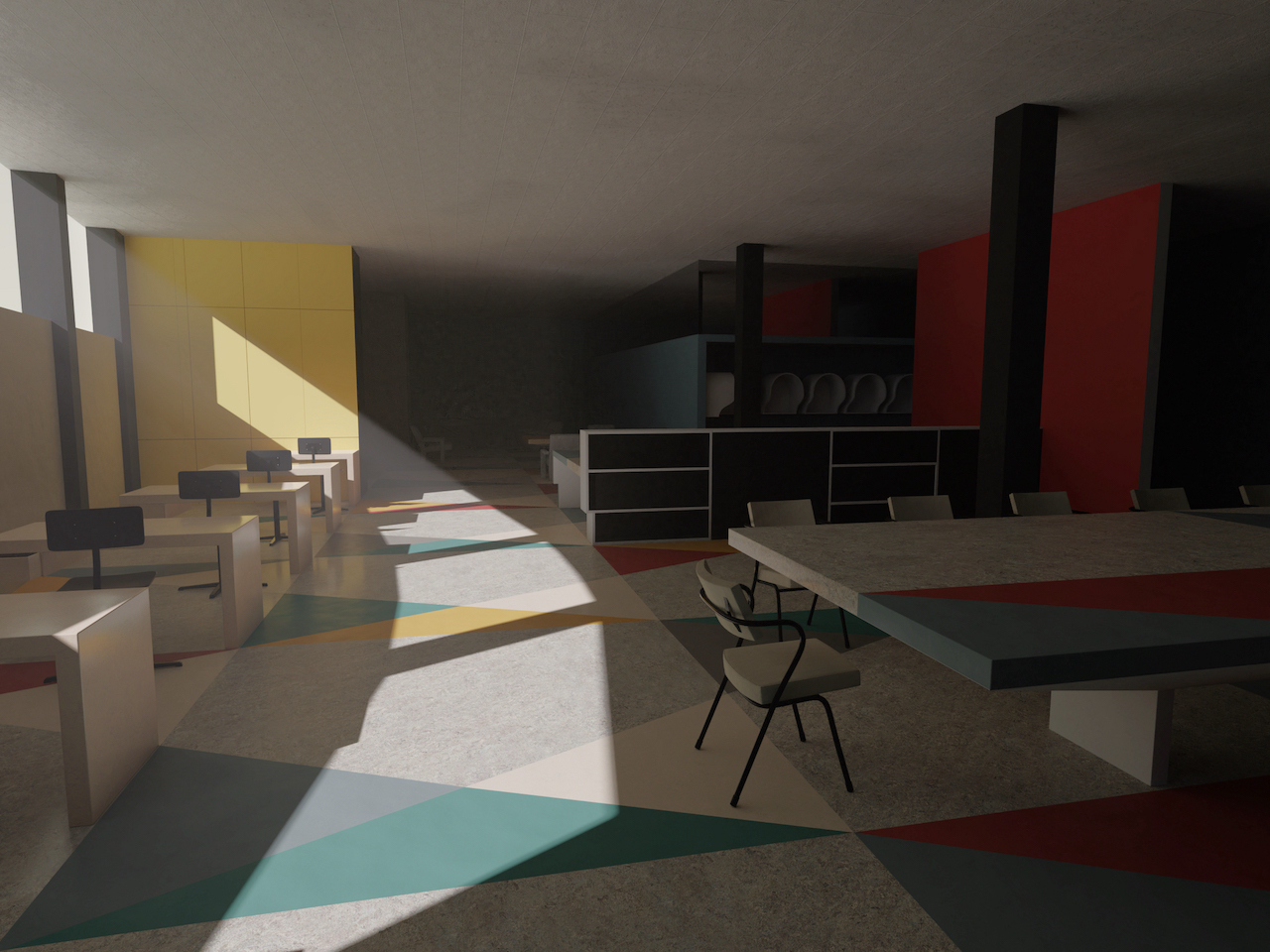 De basis van het interieur bestond uit linoleum, dat door de gehele ruimte op zowel de vloer als de tafels in een geometrisch patroon was toegepast. Dit creëerde structuur en eenheid in de grote, onregelmatige ruimte en resulteerde in een ensemble dat meer op een kunstwerk leek dan op een kantoor.