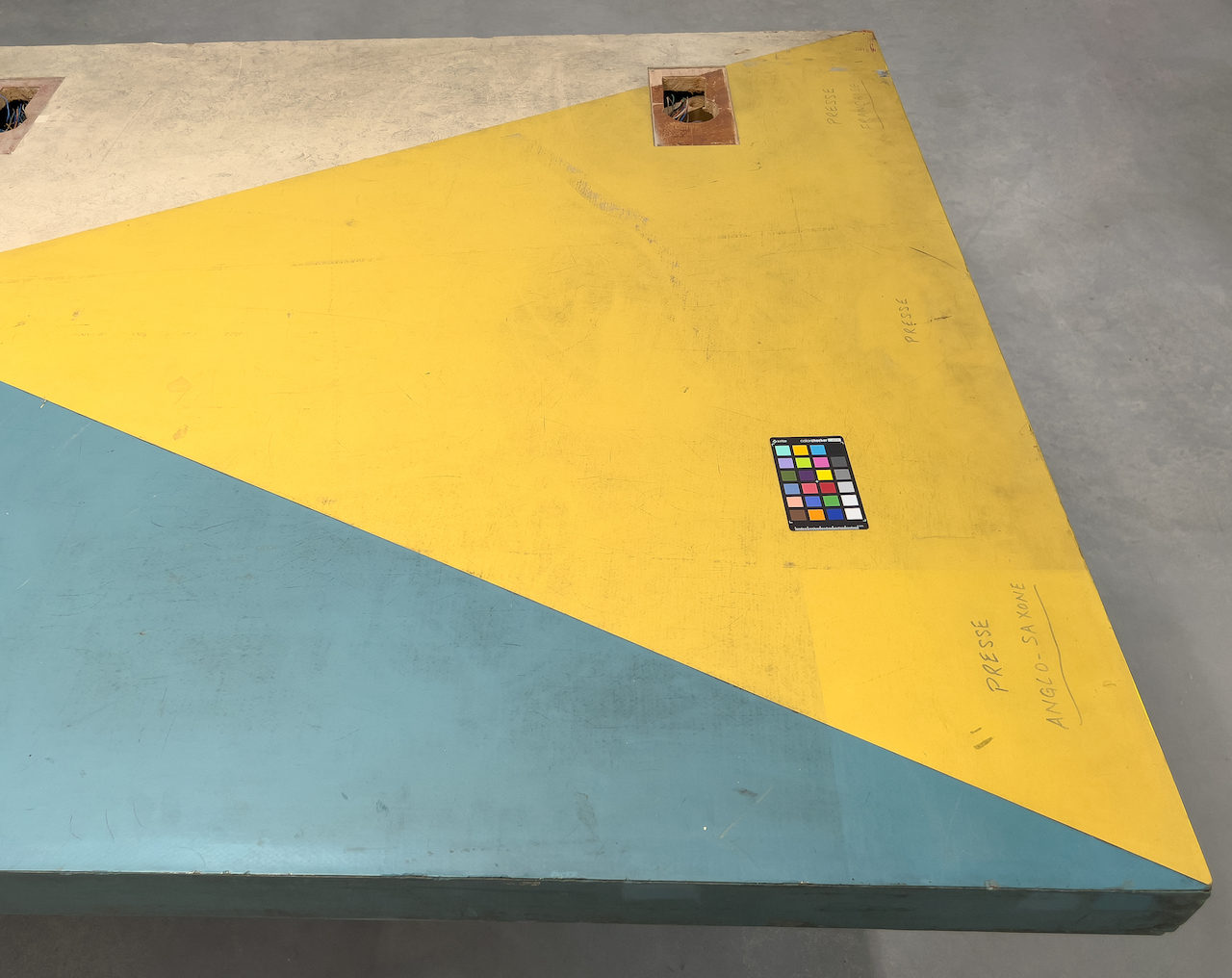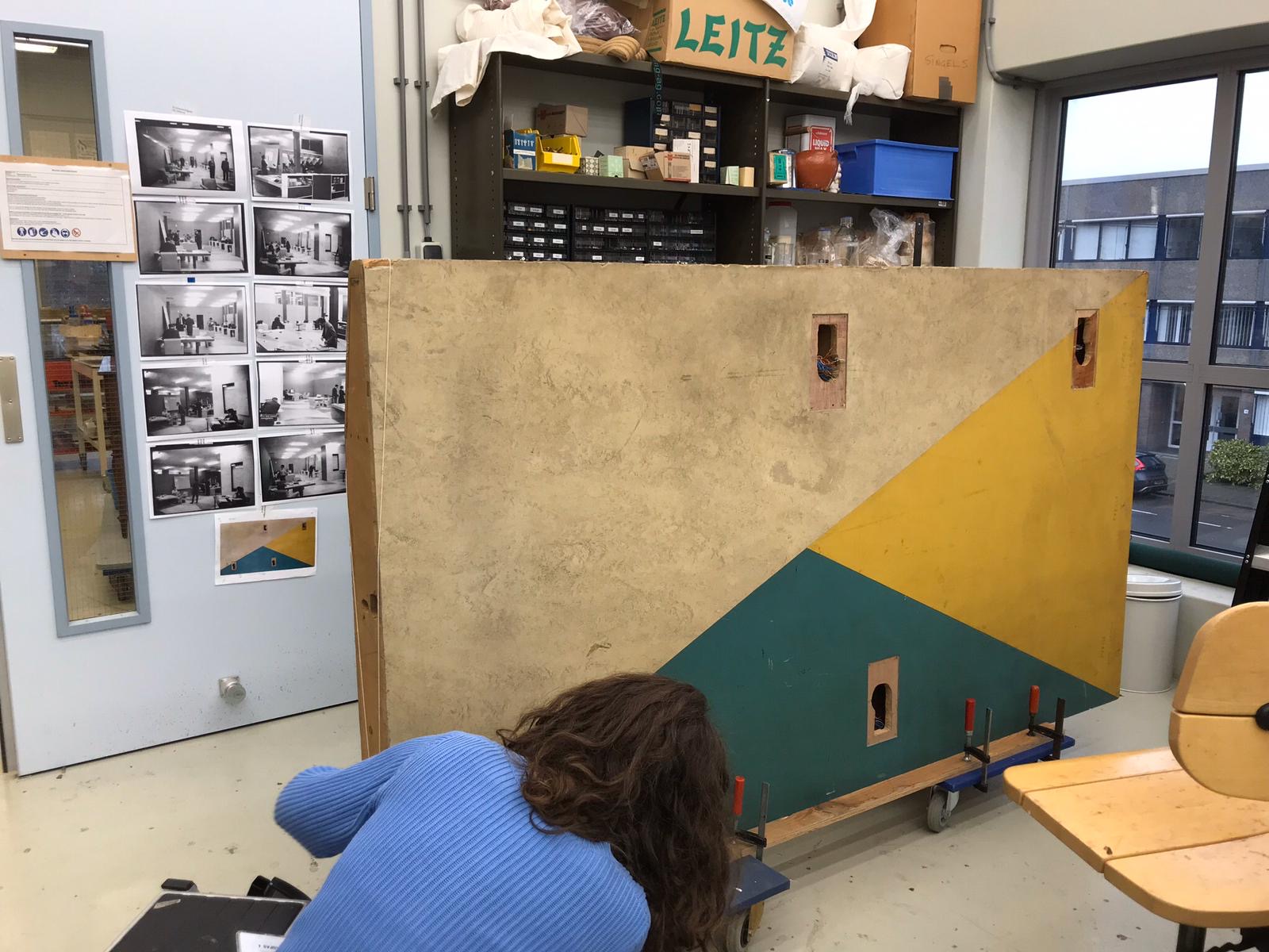 In 2020 deed ik onderzoek naar de waarde van de gebruikssporen in het perskamerinterieur. Deze houden de originele context van het ensemble voor het UNESCO hoofdkwartier zichtbaar. In 2022 behandelde ik de linoleumtafels, waarbij ik vervuiling verwijderde en gebruikssporen daterend uit de periode van gebruik bij UNESCO behield.